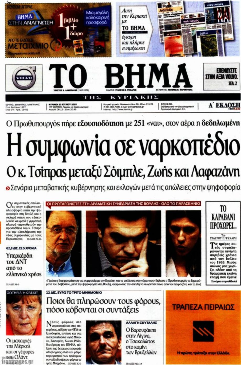 Heute: Titelblatt der griechischen Sonntagszeitung "To Vima" (liberal): „Die Vereinbarung auf einem Minenfeld - Tsipras zwischen Schäuble, Zoi und Lafazanis“