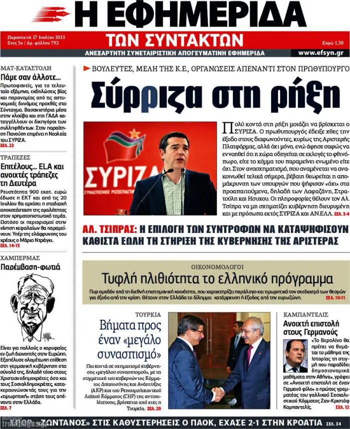 Heute: Titelblatt der griechischen Tageszeitung Efimerída ton Syntaktón (links): „Mit Volldampf zum Bruch“.