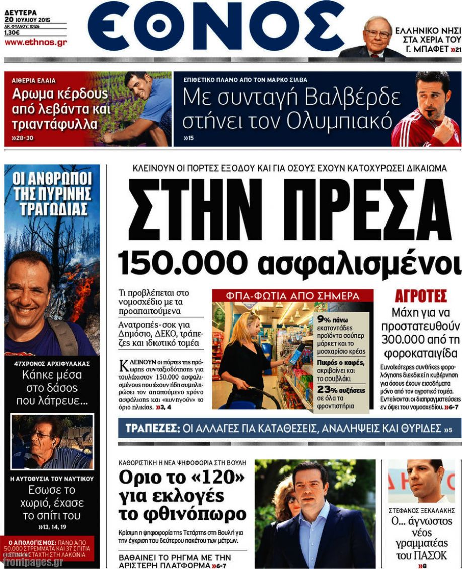 Heute: Titelblatt der griechischen Tageszeitung „Éthnos“ (liberal): „In der „150.000 Versicherte in der Mangel“