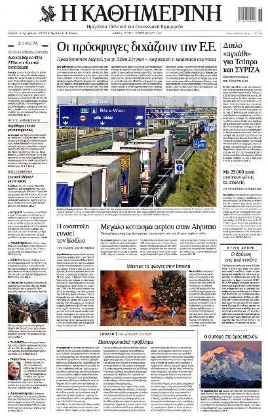 Heute: Titelblatt der griechischen Tageszeitung „Kathimeriní“ (konservativ): „Die Flüchtlingsfrage spaltet die EU“
