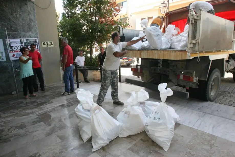 Der Countdown läuft: In Pyrgos auf der Peloponnes begann bereits am Donnerstag die An- bzw. Auslieferung von Materialien, die für die reibungslose Durchführung der Parlamentswahlen am Sonntag unerlässlich sind. In den abgebildeten Säcken befinden sich die Stimmzettel. (Foto: © Eurokinissi)