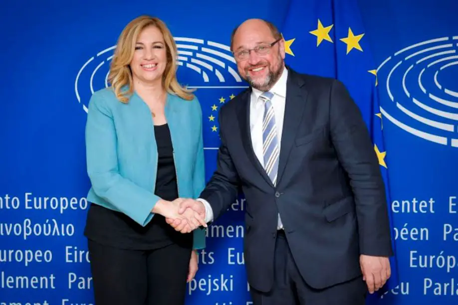 Unser Foto (© Eurokinissi) entstand am 23. Juni in Brüssel während eines Treffens von Schulz mit der PASOK-Vorsitzenden Fofi Gennimata.