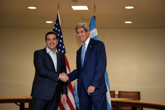 Am Rande der der UNO-Generalversammlung in New York hat sich Tsipras heute auch mit dem US-Außenminister John Kerry getroffen. Anwesend war auch der griechische Außenminister Nikos Kotzias. Zu den Hauptgesprächsthemen gehörten die Zypernfrage sowie die Namensfrage der ehemaligen Republik Mazedonien (UNO-Kurzbezeichnung: FYROM). Kerry brachte in diesem Zusammenhang den Vorsatz der USA zum Ausdruck, sich für eine Lösung dieser beiden Problemfelder einzusetzen. Was die Namensfrage der FYROM betrifft, so wiederholte Tsipras die Position Griechenlands, dass es sich um einen zusammengesetzten Namen mit geographischer Bestimmung handeln müsse. Dieser Name, so die Forderung Athens, müsse für sämtliche Bereiche des Nachbarlandes angewendet werden.