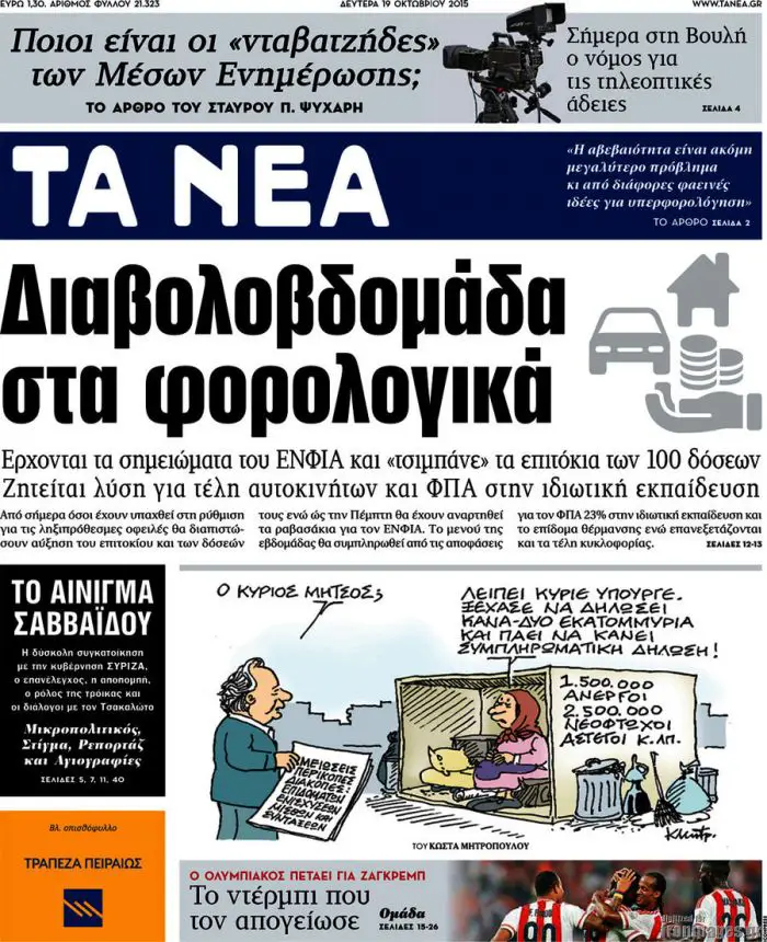 Heute: Titelblatt der griechischen Tageszeitung Ta Nea (liberal): „Teuflische Woche für das Steuerthema“