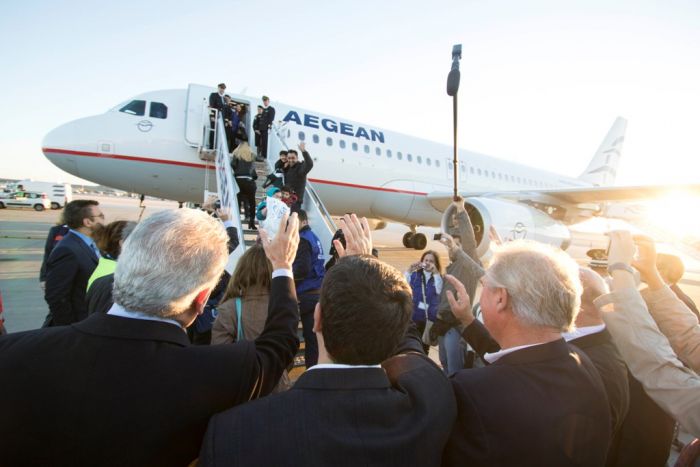 Unser Foto (© Eurokinissi) entstand am heutigen Mittwoch bei der Verabschiedung der 30 Flüchtlinge nach Luxemburg. Die Reise traten sie mit einer Maschine der griechischen Fluggesellschaft Aegean an.