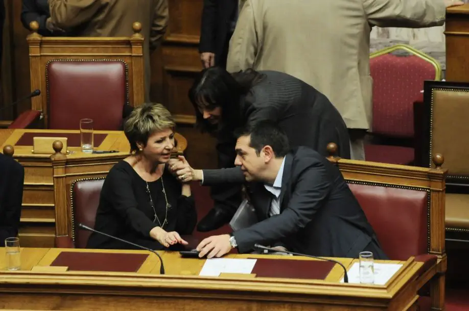 Unser Foto (© Eurokinissi) zeigt Premier Alexis Tsipras (r.) gemeinsam mit seiner Regierungssprecherin Olga Gerovassili im Parlament.