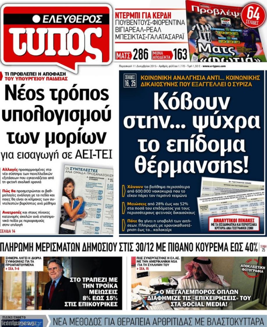 Heute: Titelblatt der griechischen Tageszeitung „Eléftheros Týpos“ (konservativ): „Sie kürzen eiskalt … den Heizungszuschuss“