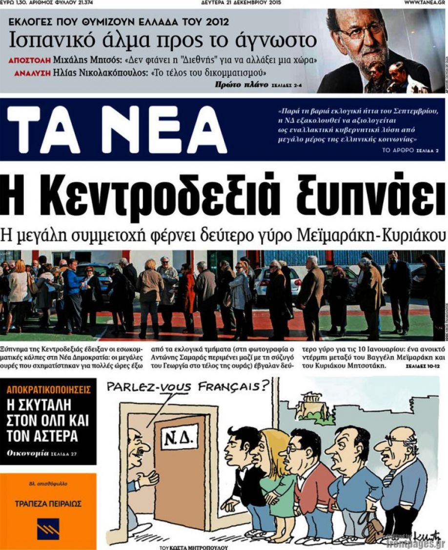 Heute: Titelblatt der griechischen Tageszeitung Ta Néa (liberal): (zur Wahl eines neuen Vorsitzenden der ND) „(Das Spektrum) Mitte-rechts erwacht“