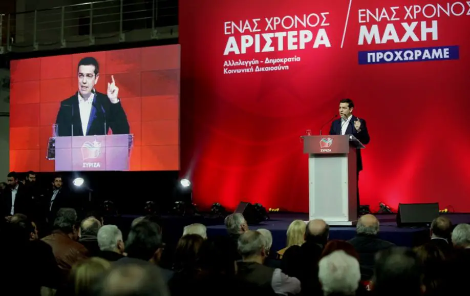 Unser Foto (© Eurokinissi) zeigt den SYRIZA-Vorsitzenden und Ministerpräsidenten Alexis Tsipras am Sonntagabend während seiner Rede vor tausenden Parteimitgliedern und Sympathisanten im Athener Tae Kwon Do-Stadion im Süden Athens.