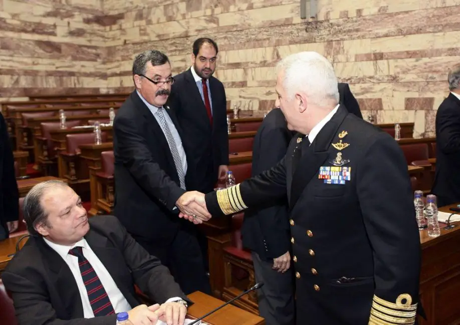 Unser Foto entstand während der geschlossenen Sitzung des Rates für Nationale Verteidigung und Außenpolitik am Mittwoch im Parlament. Rechts im Bild Generalstabschef Admiral Evangelos Apostolakis und der Abgeordnete Nikos Pappas von der Chryssi Avgi (2.v.l.).