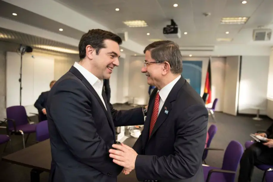 Unser Archivbild (© Eurokinissi) zeigt Ministerpräsident Alexis Tsipras (l.) mit seinem türkischen Amtskollegen Ahmet Davutoğlu während einer Begegnung in London.