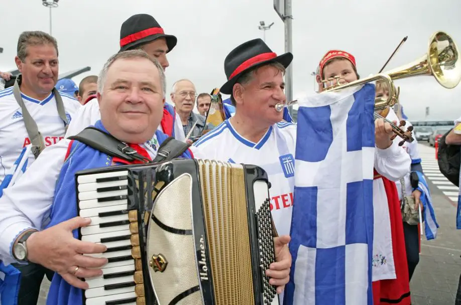 Unser Archivfoto (© Eurokinissi) entstand 2012 und zeigt Griechen anlässlich eines Fußballspieles in Deutschland.