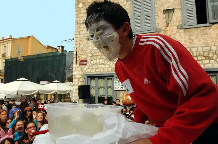Unser Archivfoto (© Eurokinissi) entstand am Rosenmontag 2007 (19. Februar) in Nafplio. Auf der Abbildung wird ein Brauch zelebriert, der unter der Bezeichnung „Der Schatz im Joghurt“ bekannt ist; Griechischer Joghurt, versteht sich.