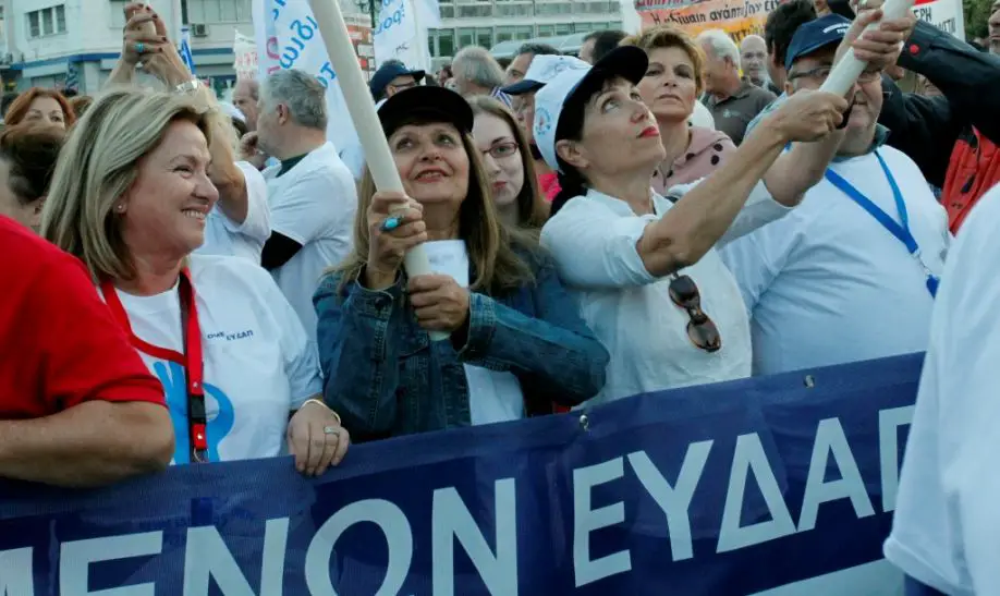 Unser Foto (© Eurokinissi) entstand am Dienstagabend während einer Protestkundgebung von Arbeitnehmern der betroffenen staatlichen Unternehmen gegen die sogenannten „Überkasse“, die von nun an über das Schicksal dieser Unternehmen bestimmt.