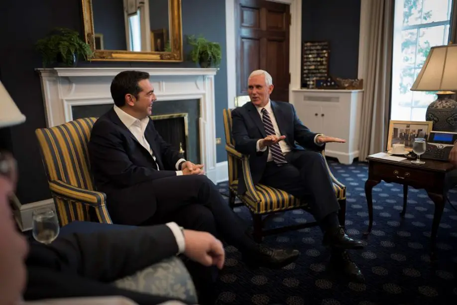Was die Modernisierung von 85 Kampfjets des Typs F-16 für insgesamt 2,4 Milliarden Euro angeht, so verteidigte Tsipras diesen Vertrag. Er erklärte, dass lediglich 1,1 Milliarden Euro aus den griechischen Staatskassen verwendet würden. Das restliche Geld werde aus anderen Ressourcen stammen. Außerdem hat Tsipras in Washington die permanenten Verletzungen des griechischen Luftraumes durch die Türkei angesprochen. Er übergab dem Vizepräsidenten der Vereinigten Staaten Mike Pence ein Dokument, in dem das Eindringen türkischer Kampfjets in griechischem Luftraum über der Ägäis aufgelistet ist. Weiterhin erörterten beide Politiker bei ihrem Treffen am Mittwoch die Lage auf dem westlichen Balkan und die Lösung der Namensfrage der früheren jugoslawischen Republik Mazedonien (FYROM). Der Besucher aus Athen stellte klar, dass sein Land einen Beitritt des Nachbarn in EU und NATO unterstütze. Voraussetzung sei eine für beide Seiten akzeptable Lösung der Namensfrage. Da dieses seit Anfang der 90er schwelende Problem bisher noch nicht gelöst werden konnte, hatte Hellas angesichts der Pläne des Beitritts des nördlichen Nachbarn in die beiden Institutionen von seinem Veto-Recht Gebrauch gemacht. Pence zeigte Verständnis für die griechischen Positionen, hob aber auch die strategische Bedeutung des NATO-Beitritts der FYROM hervor.