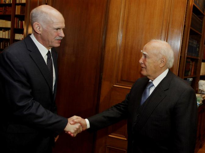 Papandreou (l.) mit dem Staatspräsidenten Karolos Papoulias (r.).