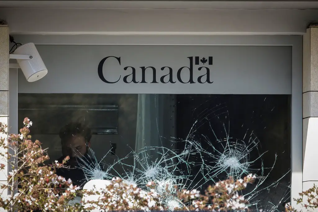 Etwa zehn Personen haben am frühen Sonntagmorgen einen Anschlag auf die kanadische Botschaft im Athener Vorort Chalandri vorgetragen. Es entstanden Sachschäden; die Fassade des Gebäudes wurde mit Farbe beschmiert. Die Täter konnten anschließend entkommen; sie trugen Motorradhelme, um nicht erkannt zu werden.
