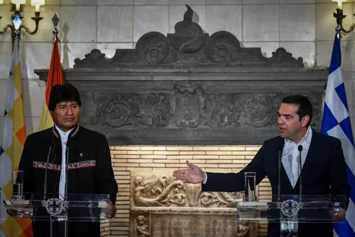 Morales stellte gegenüber Tsipras u. a. fest, dass Griechenland die Wiege der Demokratie sei. Am Donnerstabend hat der südamerikanische Gast eine Rede im Stavros-Niarchos-Kulturzentrum gehalten. In diesem Rahmen sprach er von einer friedlichen Revolution, die in seinem Land stattgefunden habe und ihn, als Vertreter der Einheimischen und der unterdrückten Bevölkerungsgruppen, an die Macht gebracht habe. (Griechenland Zeitung / eh)