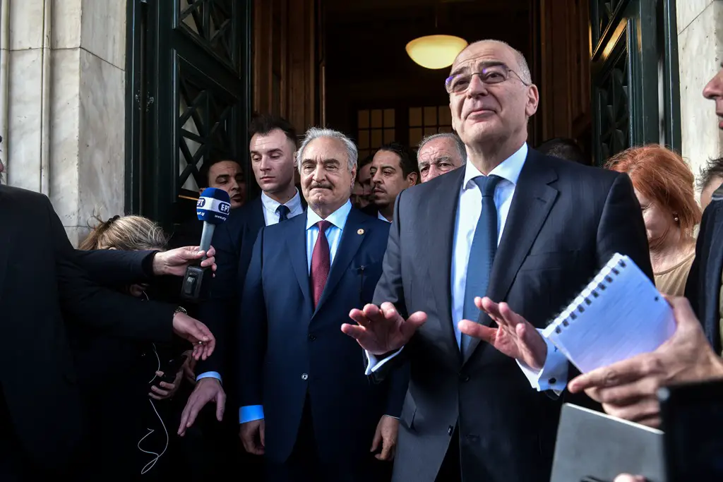 General Haftar nach seinem Besuch mit dem griechischen Außenminister Nikos Dendias (r.)