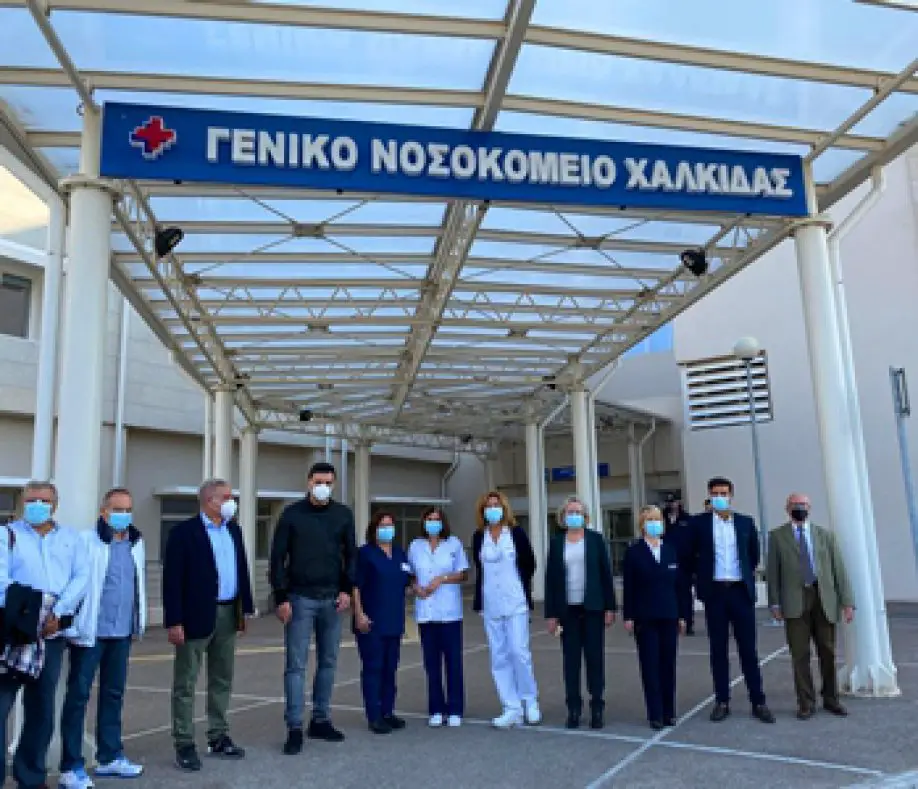 Unser Foto (© Eurokinissi) zeigt Gesundheitsminister Vassilis Kiikilias (4. V. l.) bei einem Besuch des Krankenhauses in der Chalkidiki.