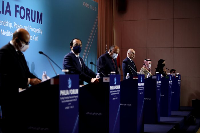 Griechenland intensiviert seine Beziehungen mit arabischen Staaten, aber auch mit Frankreich und Zypern. Am Donnerstag (11.2.) fand in Athen unter dem Motto „Freundschaft, Frieden und Wohlstand vom Mittelmeer bis zum Golf“ das erste Freundschafts-Forum „Philia“ statt. Daran beteiligten sich Außenminister Griechenlands, Zyperns, Ägyptens, der Vereinigten Arabischen Emirate, Bahrains und Saudi-Arabiens. Der französische Außenminister Jean-Yves Le Drian schaltete sich per Videokonferenz zu.