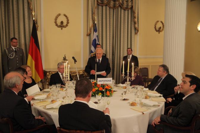 Der Gast aus Berlin traf sich am Donnerstag auch mit Oppositionschef Alexis Tsipras. Der Linkspolitiker sagte, dass es „außer einer ethischen auch eine materielle Seite" für die während des II. Weltkrieges verübten Verbrechen gebe. Andere Länder, so Tsipras, hätten bereits Zahlungen erhalten. Er zeigte sich davon überzeugt, dass seine Partei, das Bündnis der Radikalen Linken (SYRIZA) die künftige Regierung Griechenlands stellen werde. Dann sehe man sich dazu gezwungen, von Berlin Entschädigungsgelder zu fordern, sagte er.