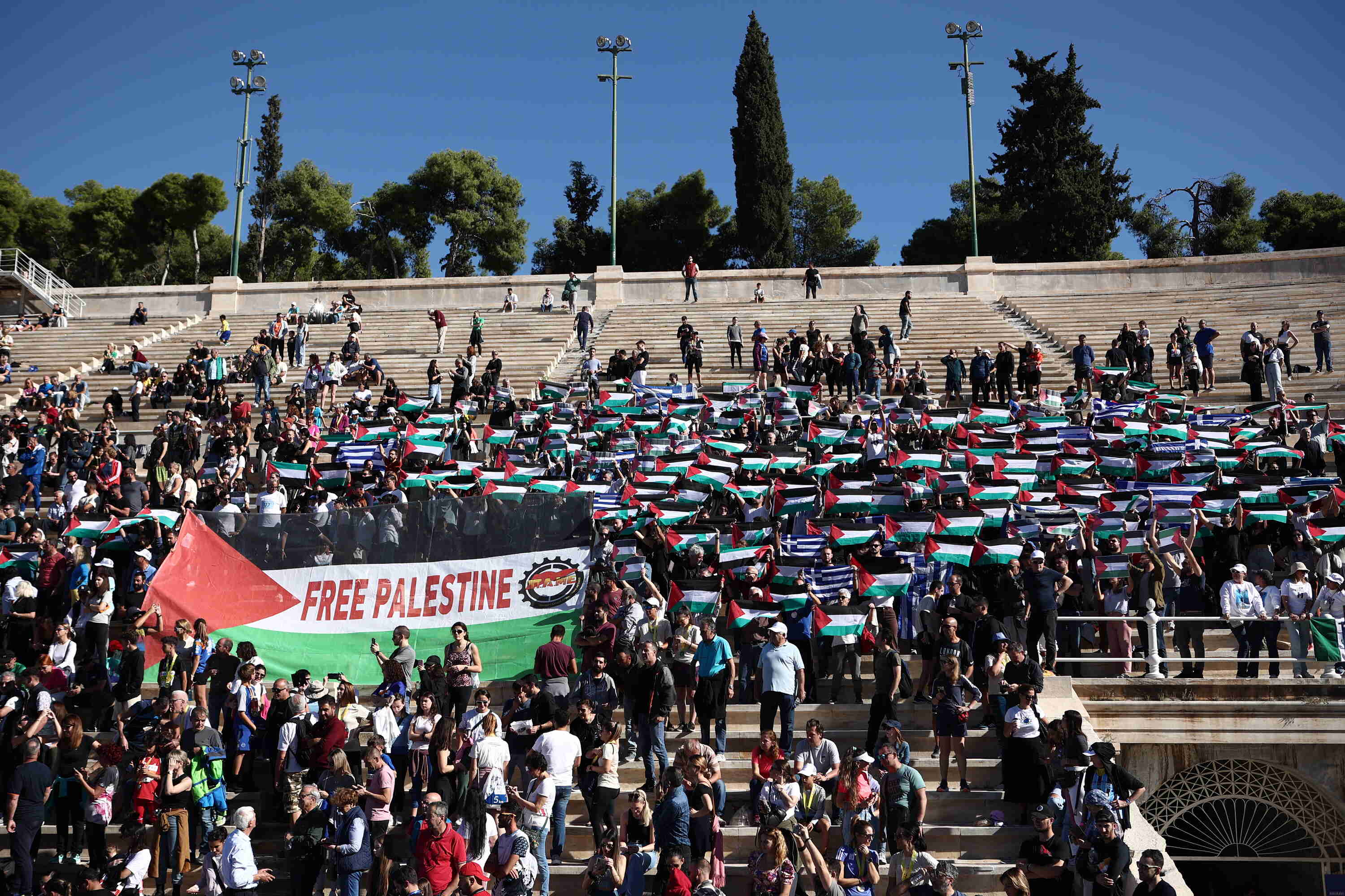 Im Bereich des Zieleinlaufs auf den Rängen des Panathinaiko-Stadions sorgten etwa 100 Personen mit pro-palästinensischen Flaggen und Transparenten für Aufsehen.