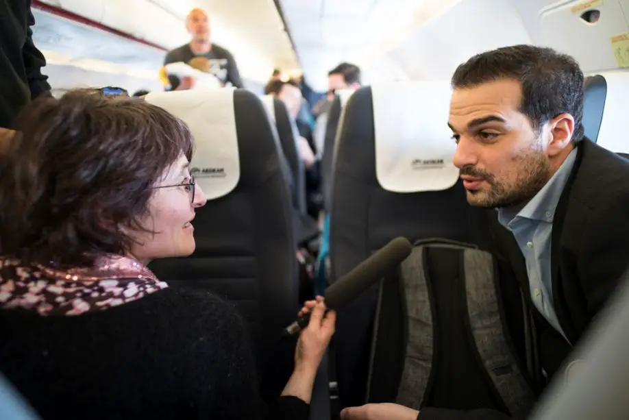 Unser Foto (© Eurokinissi) zeigt Regierungssprecher Gavriil Sakellaridis auf der Reise zum EU-Gipfeltreffen nach Brüssel am 19. März.