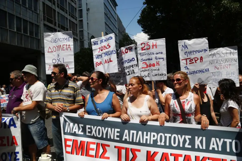 Unser Archivfoto (© Eurokinissi) entstand Anfang Juli 2016 während einer Kundgebung von Angestellten im Hotelgewerbe, die in Athen gegen Arbeitslosigkeit demonstrieren.
