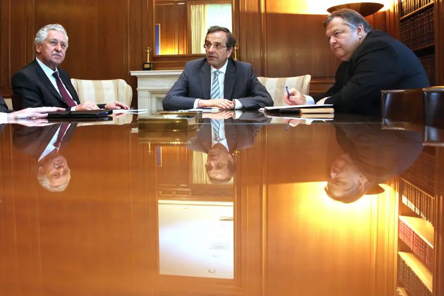 Was das 11,5 Mrd. Euro schwere Sparprogramm betrifft, dessen noch ausstehende Details bis Ende der Woche der Troika vorgelegt werden sollen, so dürfte dies vor allem weitere Rentenkürzungen beinhalten. Zudem soll das Rentenalter von bisher 65 auf 66 Jahre angehoben werden. In den staatlichen Betrieben (DEKO) soll ein Rahmentarifvertrag eingeführt werden, was bei vielen Unternehmen mit Gehaltskürzungen verbunden sein dürfte. Sozialleistungen sollen unter Berücksichtigung der Einkommen der Berechtigten weiter beschnitten werden. Die Troika soll zudem darauf beharren, dass das 13. und 14. Monatsgehalt für Beamte abgeschafft wird. Beinhaltet im Sparprogramm seien auch Schließungen bzw. Zusammenlegungen von kommunalen Unternehmen, Krankenhäusern und technischen Hochschulen. Gehaltskürzungen bei Ärzten im staatlichen Gesundheitswesen und bei Militärs sollen hingegen vermieden werden. Unterdessen hat die Troika vorläufig ihre Arbeit in Athen beendet und will erst Anfang September wieder nach Griechenland reisen. (GZeh, Foto: Eurokinissi. Diese Archivaufnahme zeigt von l.n.r.: Kouvelis, Samaras, Venizelos)