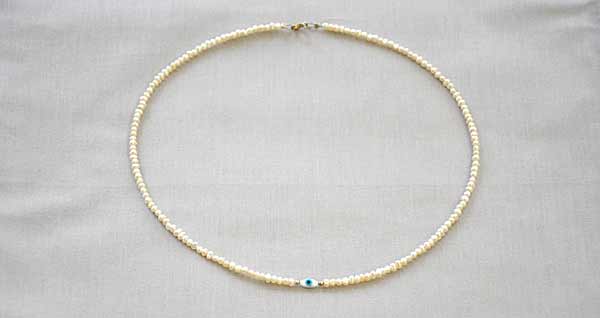 Halskette aus kleinen Süßwasserperlen, verziert mit einem kleinen Auge (Mati) gegen den Bösen Blick, handgefertigt.