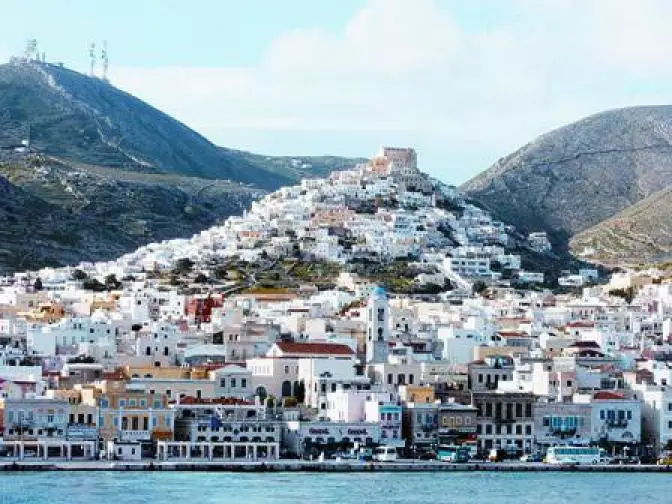 Die stattlichen Häuser, die sich jenseits des langen Kais hinziehen, sind zum Glück immer noch die alten Kaufmanns- und Patrizierhäuser; der deutsche Architekt Ernst Ziller (1837-1923) hat das Rathaus erbaut. In der im 13. Jahrhundert entstandenen Oberstadt gruppieren sich kleinere Häuser um enge Gassen zu malerischen weißen, blütendurchwirkten Vierteln. Dort künden zwei eindrucksvolle Kegelberge von der besonderen sakralen Situation der Kykladen, wo seit venezianischen Zeiten byzantinische Orthodoxie und römischer Katholizismus nebeneinander existieren: Von links grüßt, umkränzt von Klosteranlagen der Kapuziner und Jesuiten, die katholische St. Georgskathedrale und von rechts die orthodoxe Anastasiskirche.