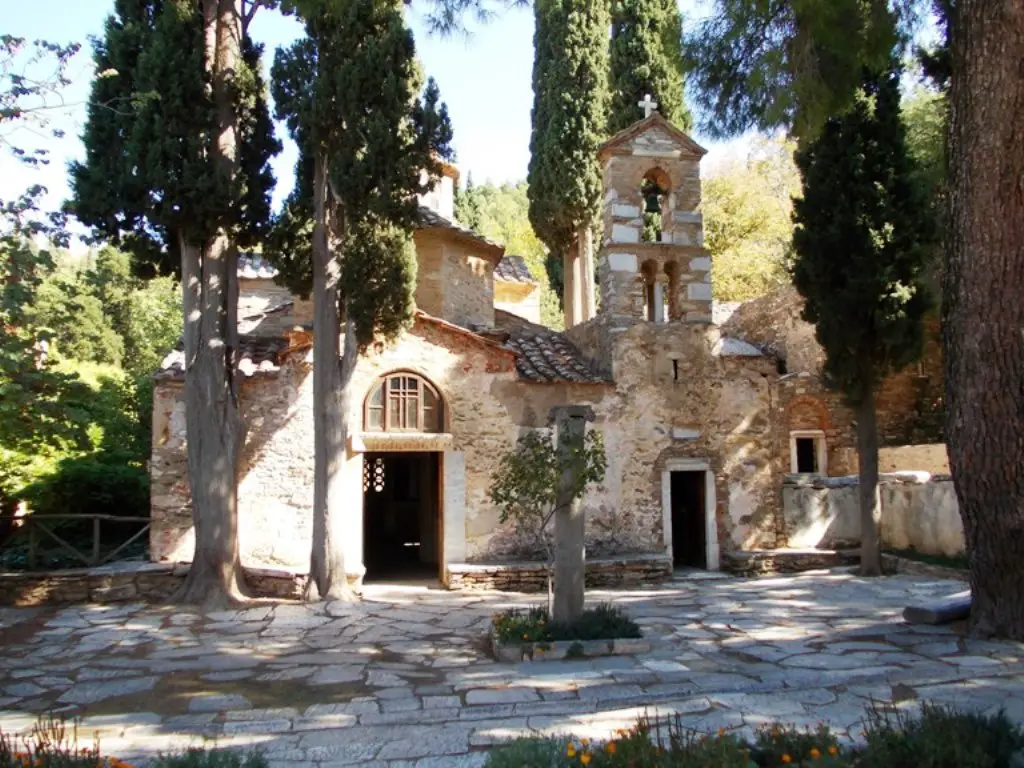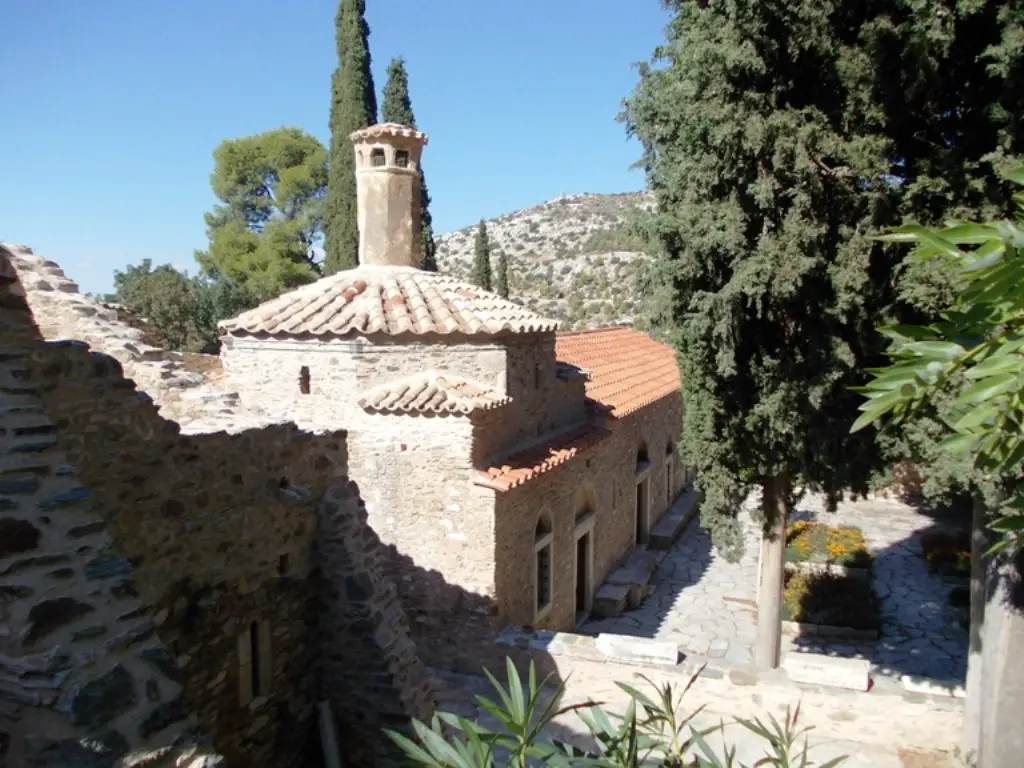 Schon der kurze Fußweg von der Straße hinauf zum Kloster stimmt auf die Besonderheit des Ortes ein. Betritt man die Anlage dann durch die Pforte in ihrer Westmauer, glaubt man, in eine längst vergangene Zeit einzutauchen. Friedvoll und still öffnet sich der beschauliche, baumbestandene Klosterhof mit seinen Gebäuden. Während die ehemaligen Zellen der Mönche sowie die Trapeza, das Refektorium, von innen an die Außenmauer angeschoben sind, erhebt sich die Kirche frei in der Hofmitte. Architekturteile früherer Bauten liegen umher. Das ganze Ensemble vermittelt dem Besucher einen durchaus harmonischen Gesamteindruck, auch wenn die einzelnen Teile aus unterschiedlichen Zeiten stammen. In ihrem Kern geht die heutige Anlage aufs 11. Jahrhundert zurück, in eine Zeit also, die für das byzantinische Reich von einer enormen kulturellen Blüte geprägt war, in deren Verlauf es politisch dann allerdings auch in sehr schweres Fahrwasser geriet. Damals entstand das Katholikon des Klosters, seine Hauptkirche, die der Muttergottes geweiht ist, präziser gesagt der Einführung Mariens in den Tempel (Εισόδια της Θεοτόκου / Eisódia tis Theotókou). Sie folgt dem bekannten Typus der Kreuzkuppelkirche, bei dem sich über dem Schnittpunkt zweier Kreuzarme im Zentrum des Baus eine Kuppel erhebt. Die eingefügten Eckräume geben ihm nach außen seine rechteckige Grundform. Im Inneren hat man bei der Errichtung in größerem Maße auf bereits vorhandenes Baumaterial zurückgegriffen, auf so genannte Spolien. Dazu zählen die schönen, aus frühchristlicher Zeit stammenden Schrankenplatten des Altarraumes ebenso wie die Säulen, welche die Kuppel tragen. Eine solche Verwendung älterer Bauteile hatte natürlich immer auch den Effekt wirtschaftlicher Ersparnis – schließlich brauchten nicht eigens neue Werkstücke hergestellt zu werden –, besonders mit Blick auf die Schrankenanlage darf aber gerade auch der zuweilen klar im Vordergrund stehende ästhetische Aspekt keineswegs unterschätzt werden. Ganz bewusst muss man sich hier des frühen, sicher entsprechend wertgeschätzten Materials bedient haben, um auf diese Weise auch einen dekorativen Akzent zu setzen. Noch der jetzige Besucher kann sich leicht davon überzeugen, dass dieses Vorhaben auch durchaus gelungen ist.