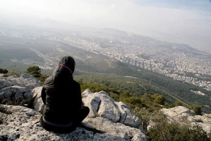 Unsere Fotos © Eurokinissi und © GZeh entstanden zu unterschiedlichen Jahreszeiten auf dem Hymettos mit Blick auf Athen bzw. mit Blick von Athen auf den Berg.