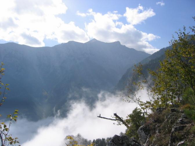 Am nächsten Tag herrscht dicker Nebel. Die Stimmung sinkt. Aber für heute ist eine Wanderung hinauf Richtung Barbalas (1850 m) geplant und das bedeutet, dass wir langsam aber stetig aus den Nebelschwaden hinein in den Sonnenschein wandern. Bald sind wir im kurzärmligen T-Shirt. Dieser Weg ist anspruchsvoll, denn es geht steil hinauf, ohne die geraden oder abschüssigen Strecken des Vortags. Aber wir sind abgelenkt durch die vielen Pilze, die wir entdecken und sammeln: Butterpilze und köstliche Parasol! Nach zwei Stunden und etlichen kleineren Pausen machen wir Rast und sehen vor uns den Barbalas und den Papa Raxi (1950 m). Auf diesem Weg ist gestern Ilias, der erprobte Bergsteiger, hinaufgestürmt, bis er die Giosou-Apostolidis-Hütte auf 2700 m erreicht haben muss. Für uns reicht es bis hierher, aber wir sind neugierig darauf geworden, wie es weiter geht hinauf auf die Spitzen des Olymps.