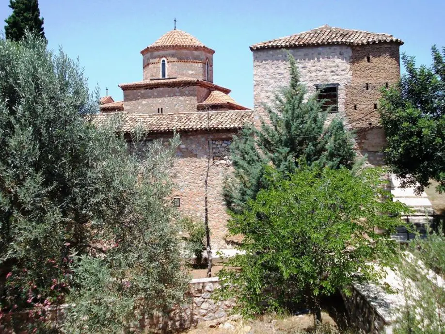 Schon von weitem sichtbar liegt das Kloster etwa sechs Kilometer nördlich von Nea Epidavros auf einem Plateau am Hang des Asprovouni. Schilder weisen zwar auf die Anlage hin, die meisten Reisenden jedoch fahren achtlos an ihnen vorüber. Wer sich aber die Mühe macht anzuhalten und die nur wenigen Meter zum Kloster hinaufzugehen, wird dafür reichlich belohnt. Sogleich nämlich taucht man ein in die ruhige und stimmungsvolle Atmosphäre, die bereits den liebevoll gestalteten Bereich vor der fast wie eine kleine Trutzburg daliegenden Anlage erfüllt.