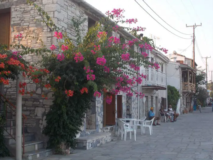 Der Ort verfügt über eine Fülle anziehender Tavernen, Cafés und Bars. Mehrere davon direkt am Meer, andere im Ortskern, wo sie sich, dekoriert mit kleinen Lichtern, meist romantisch hinter dem Blattwerk oder den Blütenvorhängen dichter Lauben verstecken. Über die gepflasterte, autofreie kleine „Platia“, einem Paradies für spielende Kinder, weht Abend für Abend der Duft frisch gebackener Kalamari und gegrillter Souflakia. Hier schließt sich eine kleine touristische Basarstraße an, in der man Strandzubehör und Souvenirs aller Art finden kann …