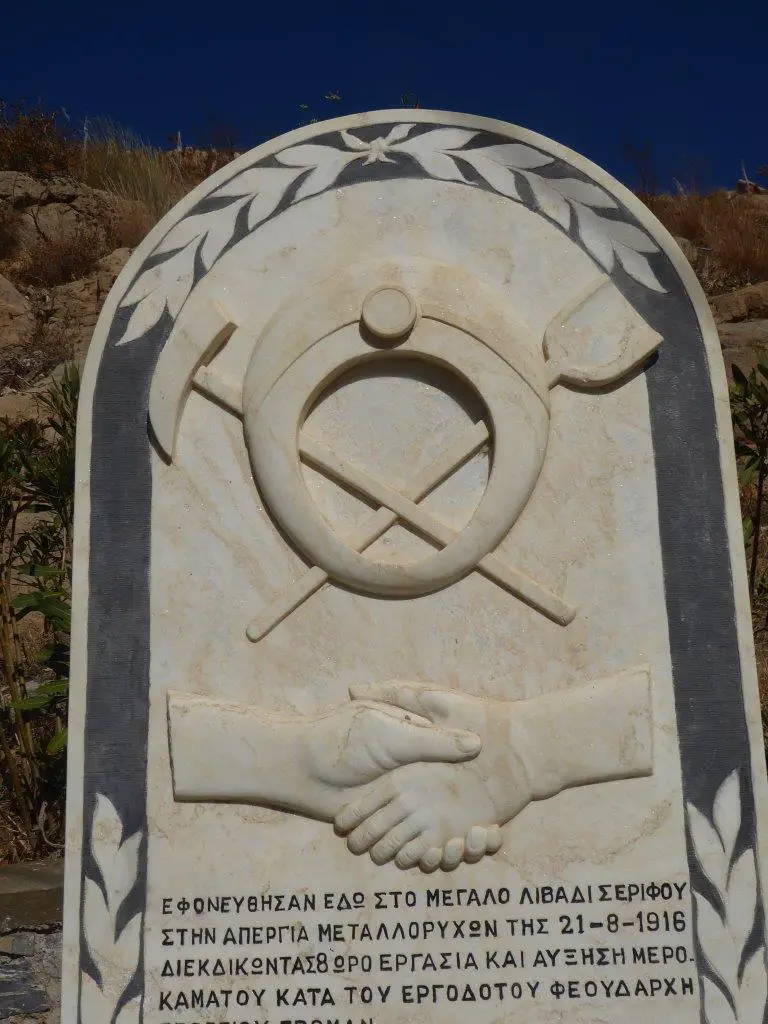 In Mega Livadi, einem anderen schönen Strand in einer Bucht, beinahe wie ein Binnensee, rosten Teile der Verladeanlagen vor sich hin. Spuren von Förderbändern, Reste einer Bergarbeiterunterkunft zerbröseln, die klassizistische Fassade des Bürogebäudes bröckelt, das Dach ist eingefallen. Müllcontainer sind davor abgestellt, fast ein symbolhaftes Bild. Überhaupt: Rostende Reste vor rostbraunem Fels. Vergangene Pracht, traurige Hinterlassenschaft. Der Ort mit Taverne und einigen wenigen Häusern, dem üblichen „Altenheim“. Im Schaukasten der Gemeinde wird ein „Schöner Winter“ gewünscht, „kalo chimona", wohl wissend, dass ein Teil der Einwohner den Winter gewiss nicht hier verbringen wird. Ein Denkmal von 2009 trägt die Büste eines jungen Mannes auf rau gesägtem Marmorsockel: Der Gründer der Bergarbeitergewerkschaft, ein Anführer im Kampf um bessere Arbeits- und Lebensbedingungen. Am anderen Ende der Bucht ist der Bereich um das Denkmal des Bergarbeiterstreiks, der blutig endete, frisch geweißelt, die Inschrift erneuert und damit lesbar. Marmorn schütteln sich zwei armlose Hände in sozialistischer Ikonografie gegenseitig. Statt Hammer und Sichel kreuzen sich darüber Hacke und Schaufel der Bergleute. Reste einer Kranzniederlegung rotten vor sich hin.