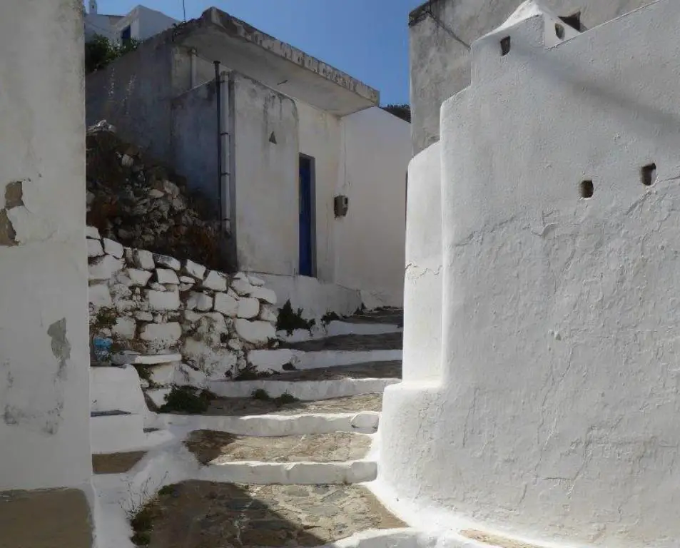 Auf dem schattigen Kirchplatz kehrt eine andere alte Frau die herabgefallenen Oliven auf. Sie hat den Schlüssel zur Kirche der Madonna und lässt uns kurz ein in das Dunkel des ältesten Gotteshauses der Insel, ein Kreuzkuppelbau aus dem 10. Jahrhundert mit verblassten Fresken aus dem 14. und 17. Jahrhundert. Was sie darstellen, erkennen wir nicht, und sie weiß es auch nicht zu sagen. Ihre Arbeitsschlappen hat sie draußen stehen gelassen und trägt drinnen saubere Puschen. Antike Säulen stützen die Bögen des Mittelteils. Alles ist in mystisches Dunkel getaucht. Schnell hat sie bei unserm Eintreten den Vorhang vor dem Allerheiligsten zugezogen. Auf dem Platz zeigt sie uns, welche Häuser zum Verkauf stehen, also praktisch alle. Die Blumen in den Kübeln pflegt sie, damit es nicht gar so verlassen wirkt. Es leben hier nur alte Leute, eine Handvoll noch, sagt sie bedauernd. Sie hört nur noch auf einem Ohr, und das schlecht. Besser, sie spricht selbst, dann fällt das nicht so auf.
