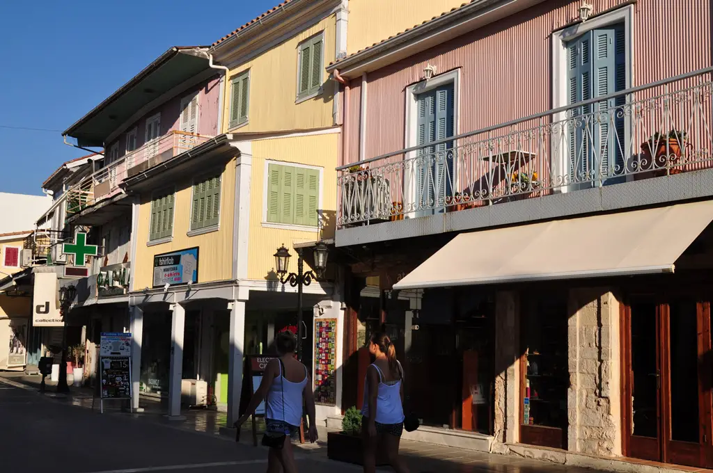 An der Odos Derpfeld liegt auch die kleine Platia, die mit ihren Cafés und Ouzerien den traditionellen Treffpunkt der Stadt bildet. Die Seitenwand der Kirche dient Kindern als Tornetz, die ganz Kleinen reiten auf Zebras, Elefanten und Kühen über den Platz: Inline-Animals sind en vogue. Wie ein Gruß aus vergangenen Zeiten wirkt der alte Drehorgelspieler, der jeden Abend mit seiner Frau seine Runden dreht. Die üblichen Souvenirgeschäfte fehlen an der Flaniermeile von Lefkada völlig. Feilgeboten wird, was die Einheimischen brauchen – von knochenbrecherischen Damenschuhen bis zur Designermode, von Unterwäsche bis zur luftgetrockneten Salami, für die die Insel landesweit berühmt ist. Die gut gestylten Kafenia am Straßenrand pflegen die Tradition der „Mezedakia“: zwei oder drei Tellerchen mit Leckereien nach Wahl des Wirtes zu Ouzo, Tsipouro, Wein oder Bier. Wer zweimal nachbestellt, erspart sich das Abendessen.
