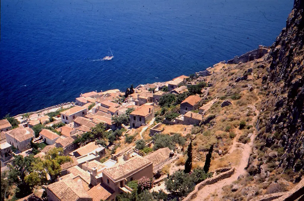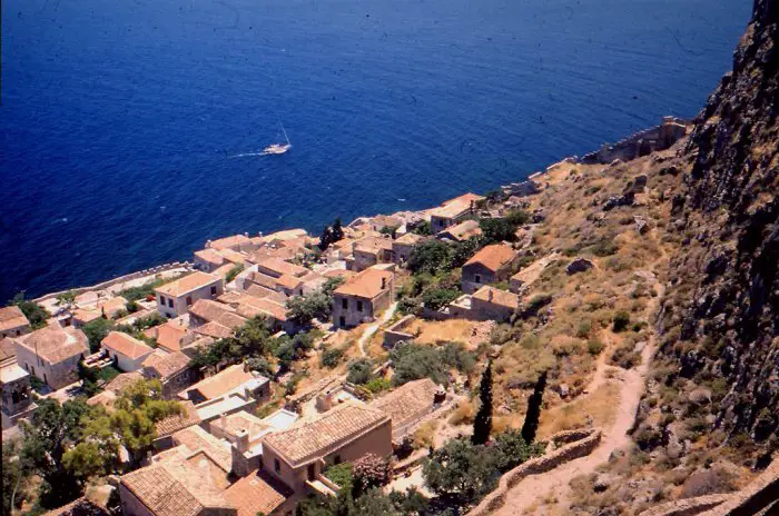 Man nennt den Felsen von Monemvassia auch „das Gibraltar Griechenlands“. Ein solcher Vergleich ist in jeder Beziehung zulässig, denn sowohl Form als auch Dimensionen der beiden Monolithen ähneln sich. Auch die einstige strategische Bedeutung Monemvassias ist offensichtlich; ein steiler Felskoloss wie dieser musste früher uneinnehmbar gewesen sein, und so war es auch. Nur „ein Zugang“ – auf griechisch moni embassia – existierte stets, die Sandbrücke zum Festland, und wenn dort Feinde auftauchten, machte man einfach das Tor dicht. Über seine Außenwände ließ sich dieses natürliche Fort nicht erobern.