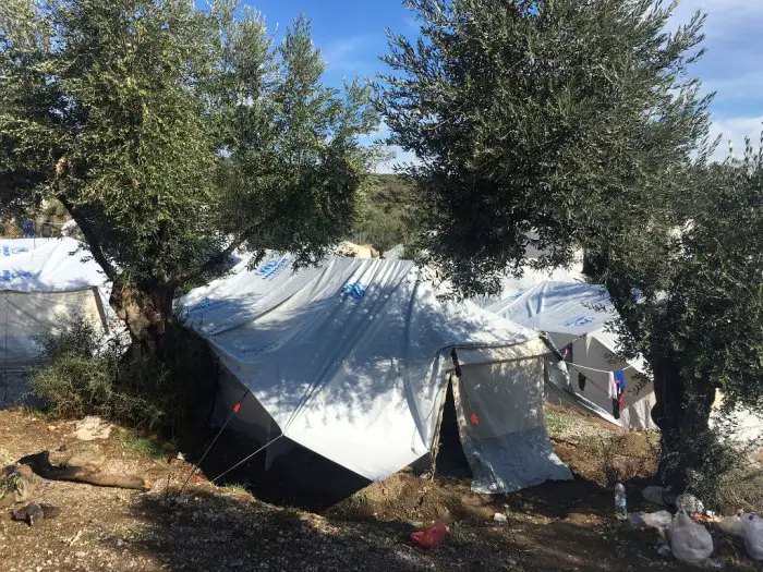 Es sind wieder deutlich mehr neue Migranten gekommen. Etwa 5.000 Neuankünfte allein im September hat das UNHCR registiert – im Oktober bisher knapp 4.000 neue Flüchtlinge, die mit Booten von der Türkei über die kurze Ägäis-Route kommen. Die meisten davon nach Lesbos. Nicht alle werden in den Hochsicherheitstrakt gepackt. Alaa Aldin Masriya aus Syrien steht vor seinem Zelt im Oliven-Feld mit Blick von außen auf die Stacheldraht-Mauern. Und versucht zu erklären, wie etwa 600 meist junge Männer in diesen Wochen ganz alleine klar kommen müssen: „Sie haben uns gesagt, ihr seid allein reisende Jungs, ihr könnt machen was ihr wollt, aber ihr bleibt hier draußen. Drinnen im Lager leben jetzt Familien und die harten Jungs, die Streit angezettelt haben, die werden bewacht – die netten Jungs bleiben draußen.“
