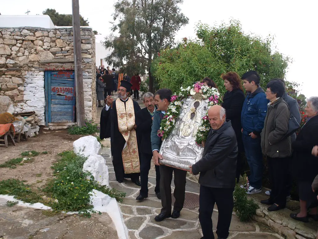 In einer feierlichen Prozession wird die Ikone der als lebensspendende Quelle dargestellten Gottesmutter am Donnerstagabend von Chora in das sonst heute leerstehende ehemalige Nonnenkloster gebracht. Dort wird sie ausnahmsweise die Nacht vor ihrem Umzug zu einem neuen Betreuer für das Jahr bis zum nächsten Donnerstag nach Ostern verbringen. Nach einem Gottesdienst werden die Opferbrote Antidoron und Prosfora aufgeschnitten und an die Festgäste verteilt. Dann folgt die Bewirtung der Besucher mit Wein, Braten und Kartoffeln im Klosterrefektorium. Gleich wird der unschlüssig herumstehende Fremde freundlich von einem Insulaner in den Schlepptau und mit an den langen Refektoriumstisch genommen, auf dem Wein und Speisen warten. Am nächsten Morgen pilgert die Inselbevölkerung erneut hinauf zum Kloster, wohnt der Messe bei und folgt dann der Ikone auf ihrem weihrauchberäucherten Weg zur neuen Panigyrades-Familie, die sie von nun an ein Jahr lang hegen und pflegen wird.