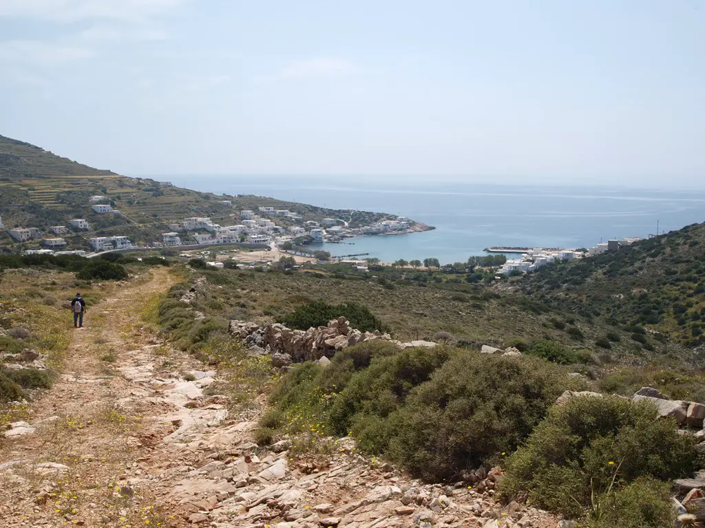 Sikinos hat einen eigenen, spröden Charakter und Charme. Lange Sandstrände mit Sonnenliegen sucht man hier ebenso vergebens wie schicke Bars und Diskos. Und natürlich sind auch Ferienclubs und Luxushotels Fehlanzeige auf der kleinen Insel mit ihren unter 42 Quadratkilometern Fläche und rund 240 ständigen Bewohner/innen. Dafür gibt es kaum befahrene Pisten und wenig begangene Wege zum Spazieren und Wandern durch eine beeindruckende Landschaft und kleine Buchten für ein erfrischendes Bad im Meer. Man wohnt in Privatzimmern oder Pensionen, von denen sich auch einige Hotel nennen, kehrt in Tavernen ein, verkostet den guten Wein eines kleinen Weinguts beim Blick auf den Sonnenuntergang, genießt die Schönheit der Natur und streift durch die kleinen, reizvoll gelegenen Ortschaften mit ihrer schlichten und homogenen Architektur. Große Teile der langgestreckten Insel mit knapp 14 Kilometern Länge bei einer maximalen Breite von 4,7 Kilometern sind rau und bergig. Gewaltig wirken Erhebungen bis zu 552 Metern auf einem so kleinen Eiland, schwindelerregend, wenn sie steil zum Meer abfallen. Beim Anblick des Zusammenspiels der schroffen Natur mit den ihr im Lauf vieler Jahrhunderte von Menschenhand sanft aufgedrückten Stempeln – in Form eines Geflechts von Terrassen und Trockenmauern – stellt sich ein ähnlich erhabenes Gefühl ein, wie beim Besuch eines der antiken Heiligtümer Griechenlands, die eine magische Einheit mit der sie umgebenden Landschaft bilden. Hier scheinen Natur und Mensch gleichermaßen in ihrem Recht zu sein und alles in einem Lot, aus dem sie nicht so leicht zu bringen ist. Sonst eher untypisch für Kykladeninseln sind die Wolken und Nebelschwaden, die die Höhen von Sikinos zuweilen umfangen und ihnen dann einen neuen, geheimnisvollen Reiz geben.