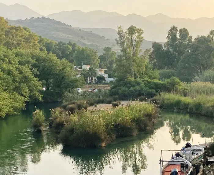 Ganzjährig Wasser führende Flüsse sind auf den griechischen Inseln ein seltenes Naturphänomen. Georgioupolis an der Nordküste Kretas hat gleich drei davon. Einer fließt mitten durchs Dorf. Ganz nahe der Mündung liegen da an den beidseitigen Kais mehrere große Fischerboote. An der Brücke über den Fluss kann man Tret- und Paddelboote mieten und damit einige hundert Meter stromaufwärts fahren. Dichtes Schilf säumt die Ufer, im Wasser tummeln sich zahlreiche Sumpfschildkröten. Die fühlen sich, so sagen es die Naturschützer, von den Menschen allerdings eher gestört.