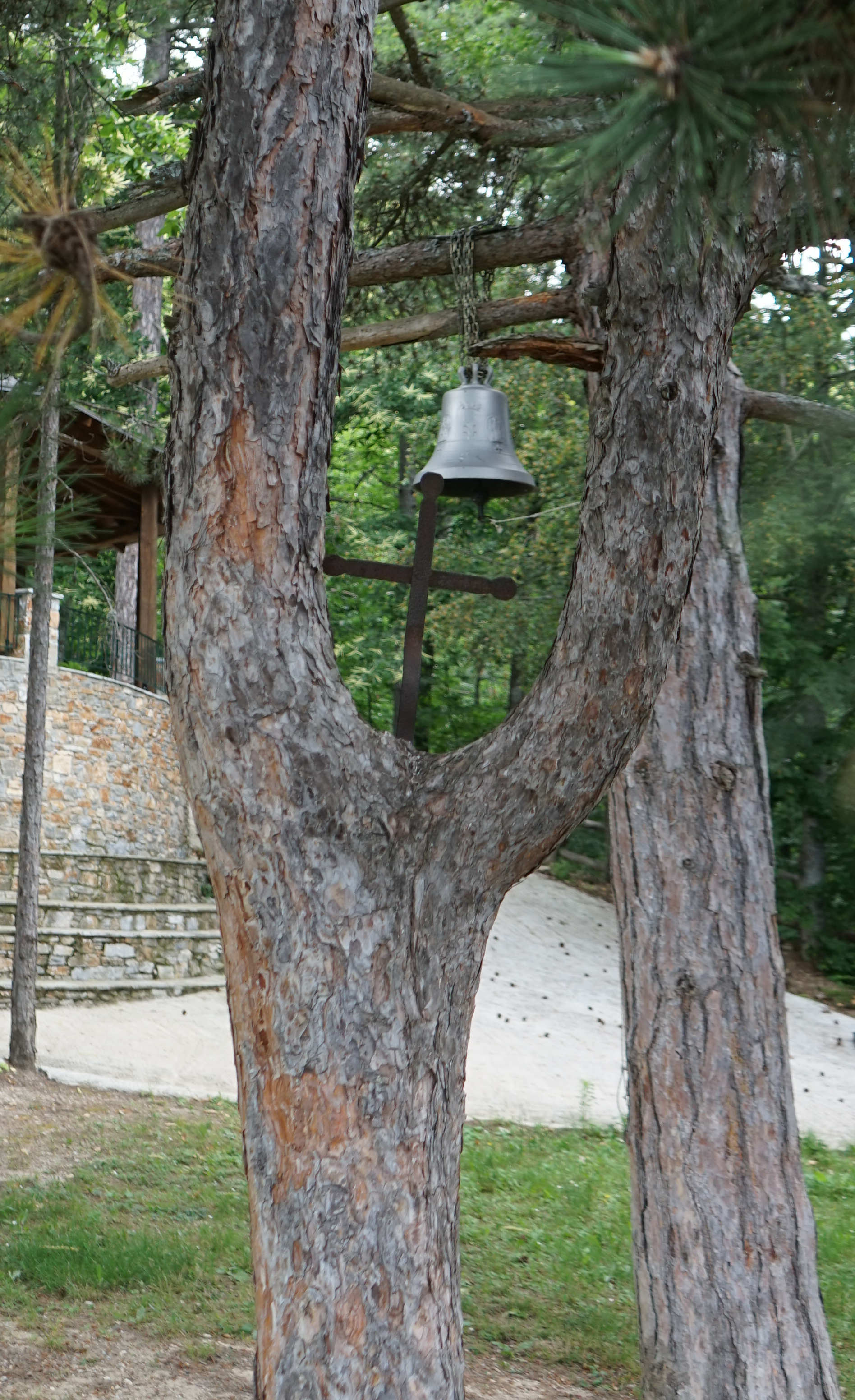 2002 wurde an hier eine Kirche errichtet und eine befestigte Straße gebaut. Während die Kinder die an einem Baum angekettete Kirchenglocke läuten, stärken sich die Erwachsenen mit einem Tsipouro, einem dem Grappa ähnlichen Tresterschnaps.
