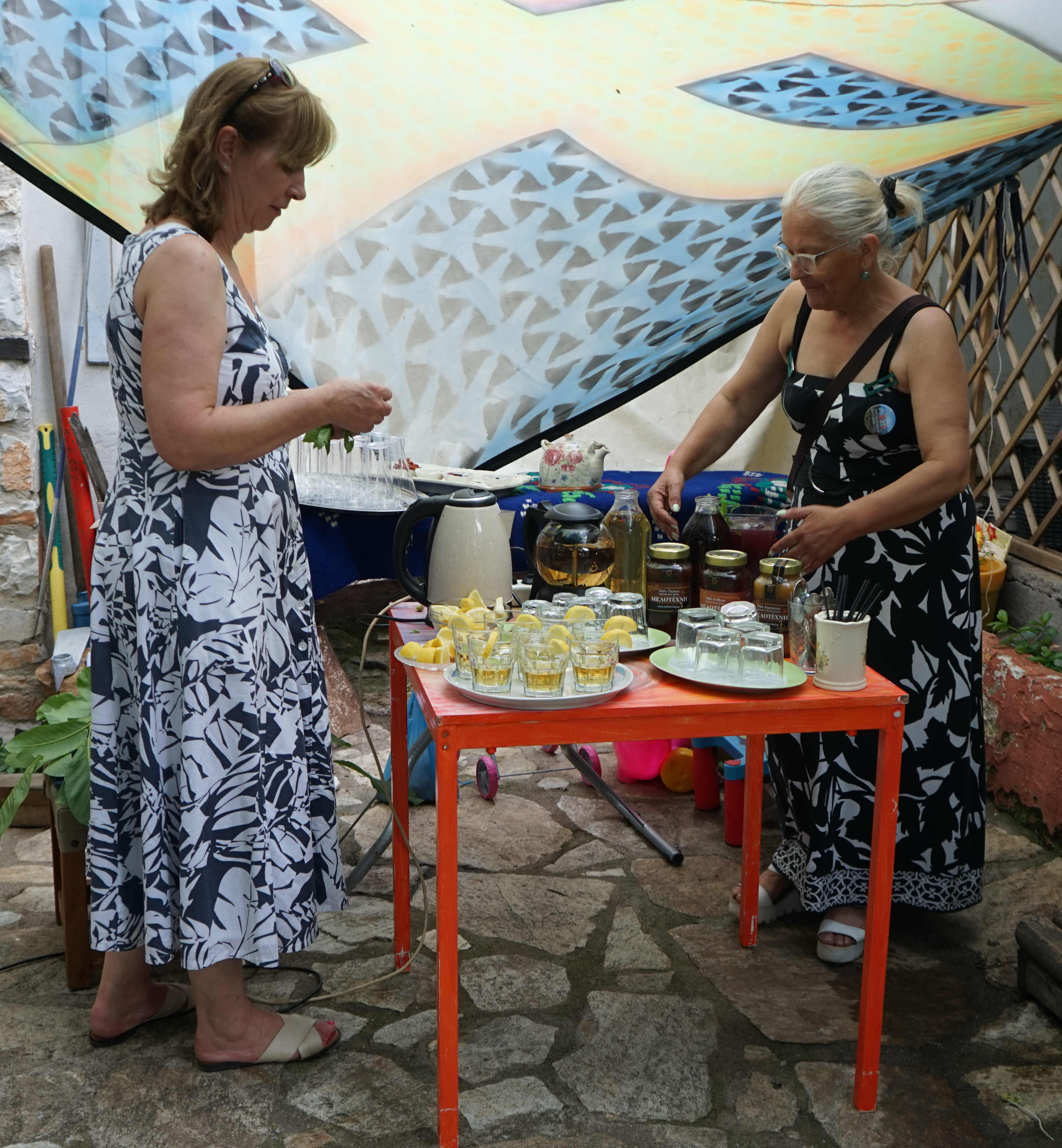 Man kann griechischen Bergtee mit anderen Teesorten oder Getränken und Zutaten kombinieren und ihn heiß oder kalt trinken. Anastasia kredenzt verschiedene Mischungen mit Sternanis, Zitrone, Likören und sogar Retsina. Der Fantasie sind keine Grenzen gesetzt, erlaubt ist, was schmeckt. Mein Favorit ist die Kombination mit Walnusslikör.