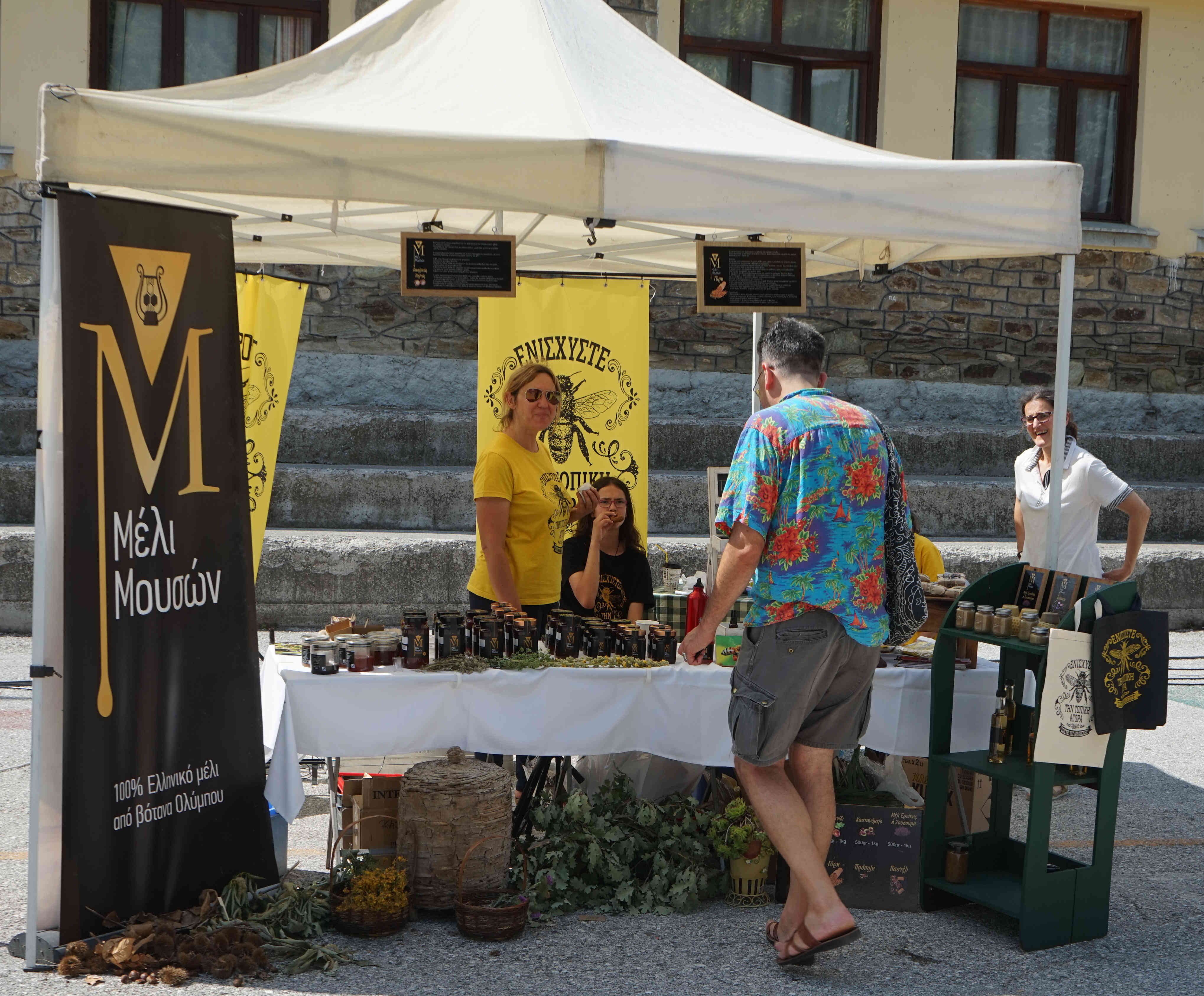 Auf dem zentralen Platz des Ortes, der Platia, sind kleine Zelte aufgebaut. Verschiedene Produzenten bieten hier ihre Waren an. An einem Honigstand werde ich zum Probieren eingeladen. Auf meine Frage hin wie es möglich sei, dass er Honig mit mehreren Geschmacksrichtungen anbieten könne, erfahre ich von dem Imker, dass er mit seinen Bienenstöcken in verschiedene Gebiete des Landes reist. Dort finden die Tiere jeweils eine andere Flora vor und entsprechend unterschiedlich ist der Geschmack des Honigs.