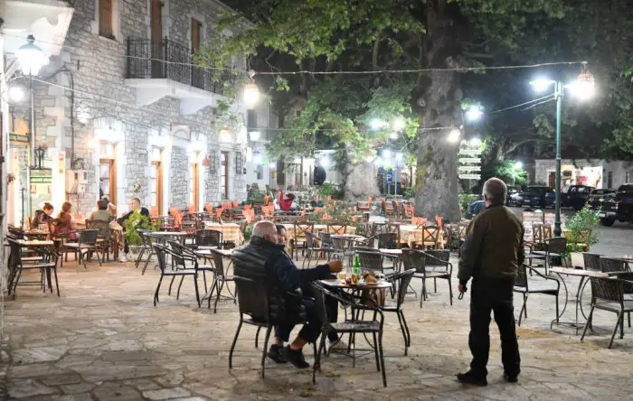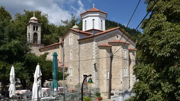 Zahlreiche Cafés und Restaurants laden zum Verweilen ein. Das Ambiente gibt einen beliebten Rahmen für Taufen und Hochzeiten ab. Und wenn es weiter unten im Hochsommer so richtig heiß und drückend wird, kommen an Wochenenden zahlreiche Temperaturflüchtlinge, um eine erholsame Nacht auch ohne Klimaanlage zu verbringen. Neben der Kirche steht ein eher unspektakuläres Denkmal. Seine Inschrift berichtet davon, dass Angehörige der Deutschen Wehrmacht während der Besatzung Griechenlands im Zweiten Weltkrieg das Dorf als „Maßnahme der Vergeltung“ vom 29. auf den 30. Januar 1944 niederbrannten. Und ebenso lapidar wie trotzig wird erläutert, dass die „Kosmites“ es wieder aufbauten, „wie es heute dasteht“. Auf der gegenüberliegenden Straßenseite sitzt Stavroula Riga, in ihrem Geschäft, das auf den ersten Blick wie ein Souvenirladen wirkt, aber auf den zweiten Blick ein weitaus größeres Sortiment des Alltagsbedarfs umfasst. Sie ist 85 Jahre alt, war mithin als Kind Zeugin der Vergeltungsaktion.