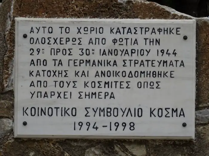 Die Geschichte wird durch ein zweites Denkmal besser verständlich, das ein wenig außerhalb von Kosmas auf der Passhöhe der Straße hinunter nach Lakonia steht. Mit ihm wird ein Sieg der EAM-Partisanen sowie „der gesamten Bevölkerung von Kosmas und der Nachbardörfer“ am 27. Juli 1943 über Besatzungstruppen des faschistischen Italiens gefeiert, und zwar mit statistischer Evidenz: Italiener gefallen: 28; verwundet: 37; gefangen: 45; geflüchtet: 1. Griechen gefallen: 1. Da war es schon nicht mehr weit bis zur Kapitulation Italiens am 8. September 1943. Das macht die Logik noch perfider, mit der „Vergeltungsmaßnahmen“ der deutschen Wehrmacht gerechtfertigt worden sind. Aber Philipas Sardelianos beispielsweise, Ortshistoriker von Kalavryta, wo die deutsche Wehrmacht ein Massaker zu verantworten hat, hat in einem umfänglichen Aufsatz dargelegt, dass es bis weit nach 1944 hinein immer wieder solche „Vergeltungsmaßnahmen“ gegeben hat. Stavroula blickt auf diese Jahr zurück: „Die Italiener …, ich erinnere mich nicht an die Jahreszahl. Viele Menschen sind weggegangen, manche in Höhlen. Hinterher sind die Partisanen von unterhalb des Dorfes heraufgekommen, da wo der Gedenkstein steht, und dort haben sie die Italiener angegriffen. Diese Schlacht haben sie gewonnen. Das feiern wir jedes Jahr mit einem großen Fest.“ Über die Zeit nach der Zerstörung von Kosmas berichtet die Zeitzeugin: „Hinterher gab es viele Familien. Große Familien kamen, junge Leute, sie haben die Häuser aufgebaut, Holz, Eisen und Steine geholt. Die Häuser hatten damals keine Ziegeldächer. Hier gab es einen Hügel mit guten Steinplatten. Es gab auch keine Straßen, um etwa nach Geraki oder in die anderen Dörfer zu kommen.“
